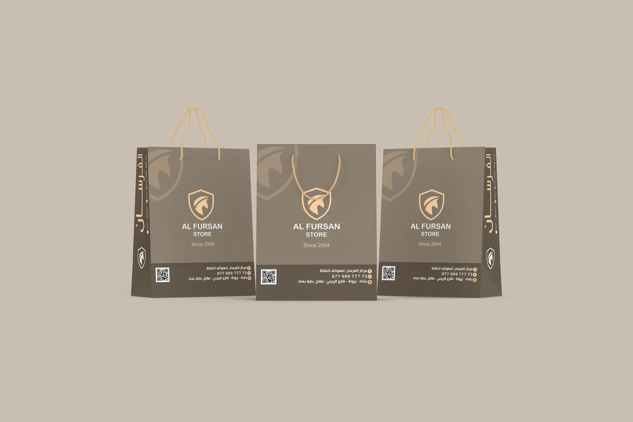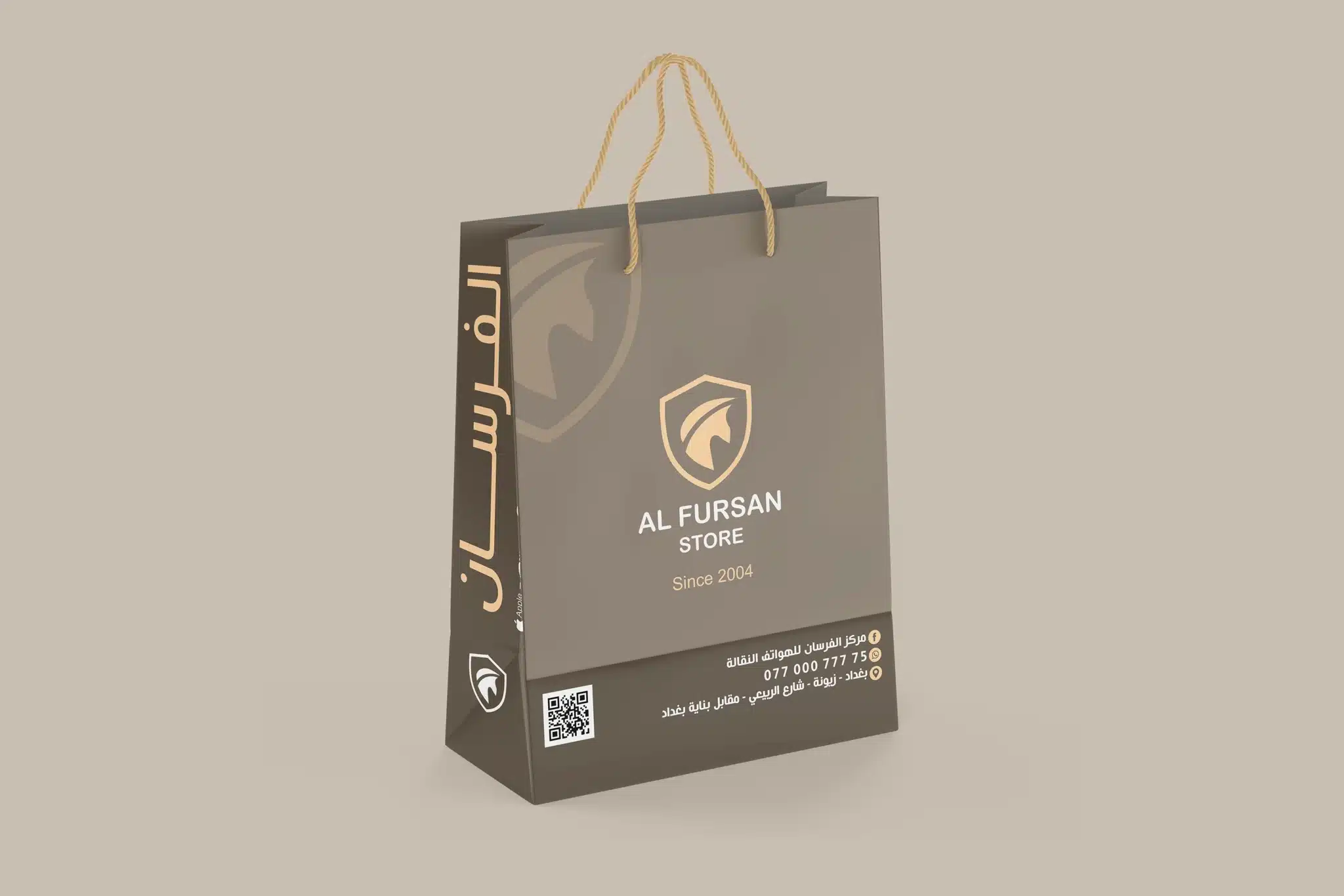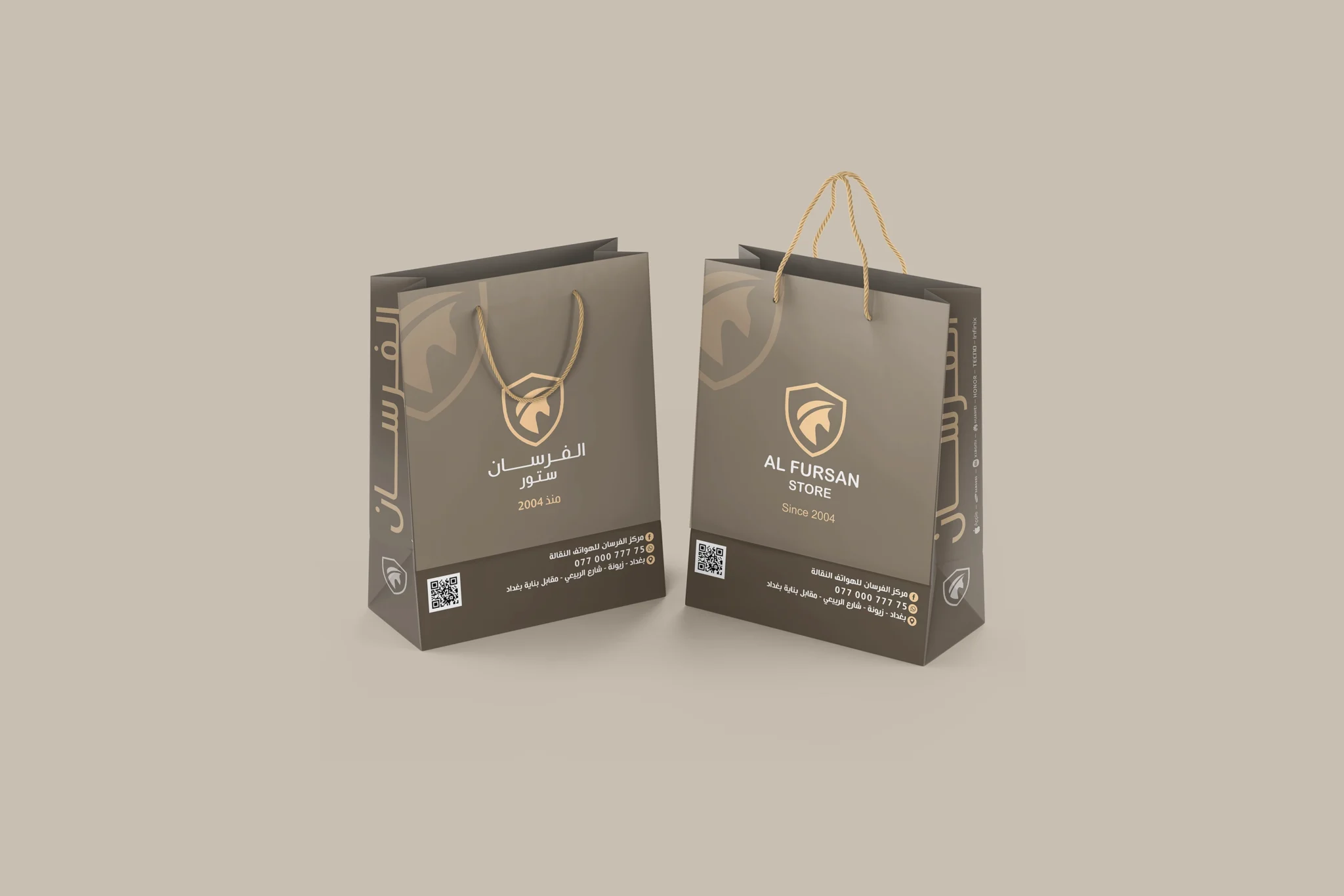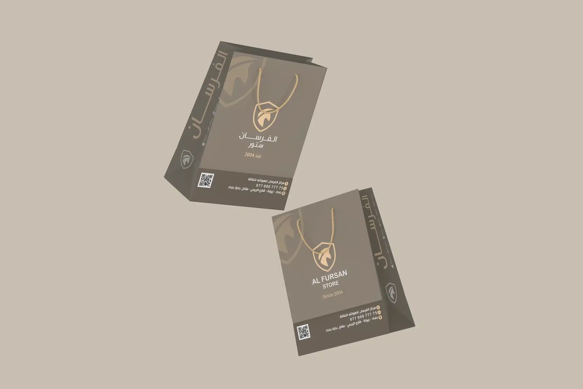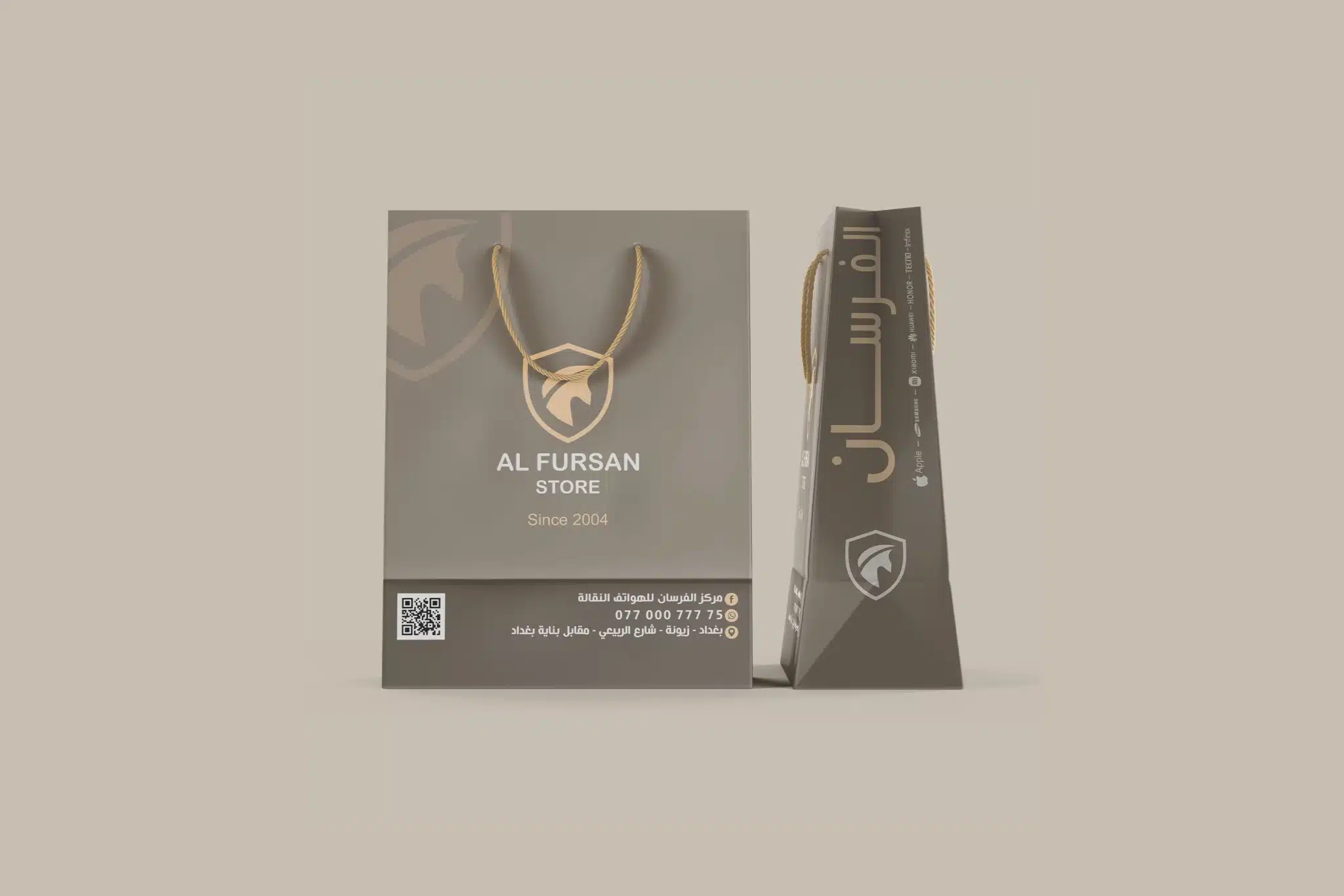 نفذنا تصميم أكياس كرتونية مخصصة لشركة الفرسان للموبايلات في بغداد، بهدف تقديم تجربة استلام أنيقة تعزز قيمة المنتج وتُرسّخ حضور العلامة. ركزنا على بساطة التكوين مع إبراز الشعار بالواجهة، وتوحيد الهوية على الجوانب، وإضافة معلومات التواصل بشكل واضح مع QR قابل للمسح. النتيجة: كيس عملي وفخم يعكس احترافية المتجر ويزيد تذكّر العلامة عند العملاء.