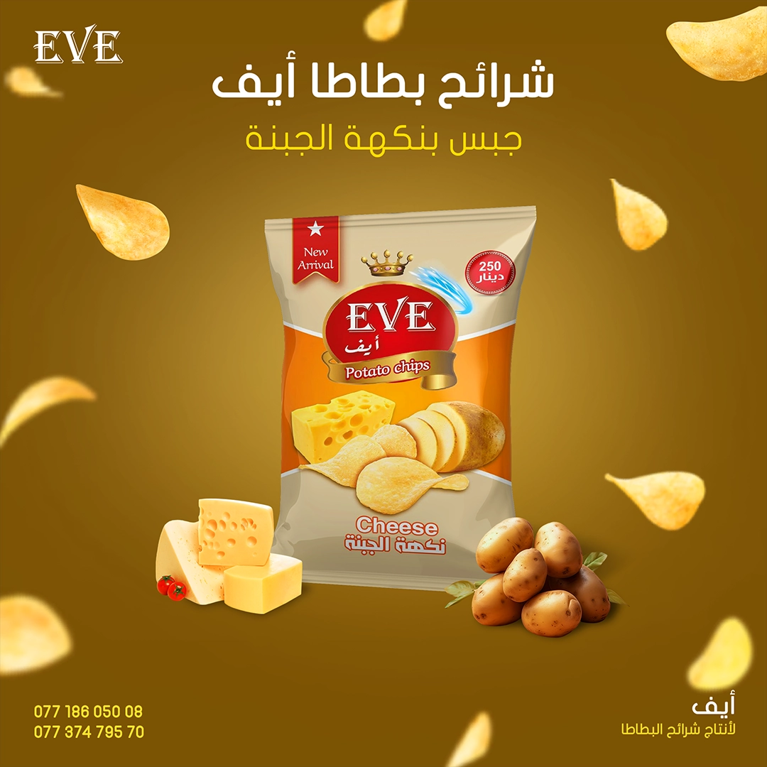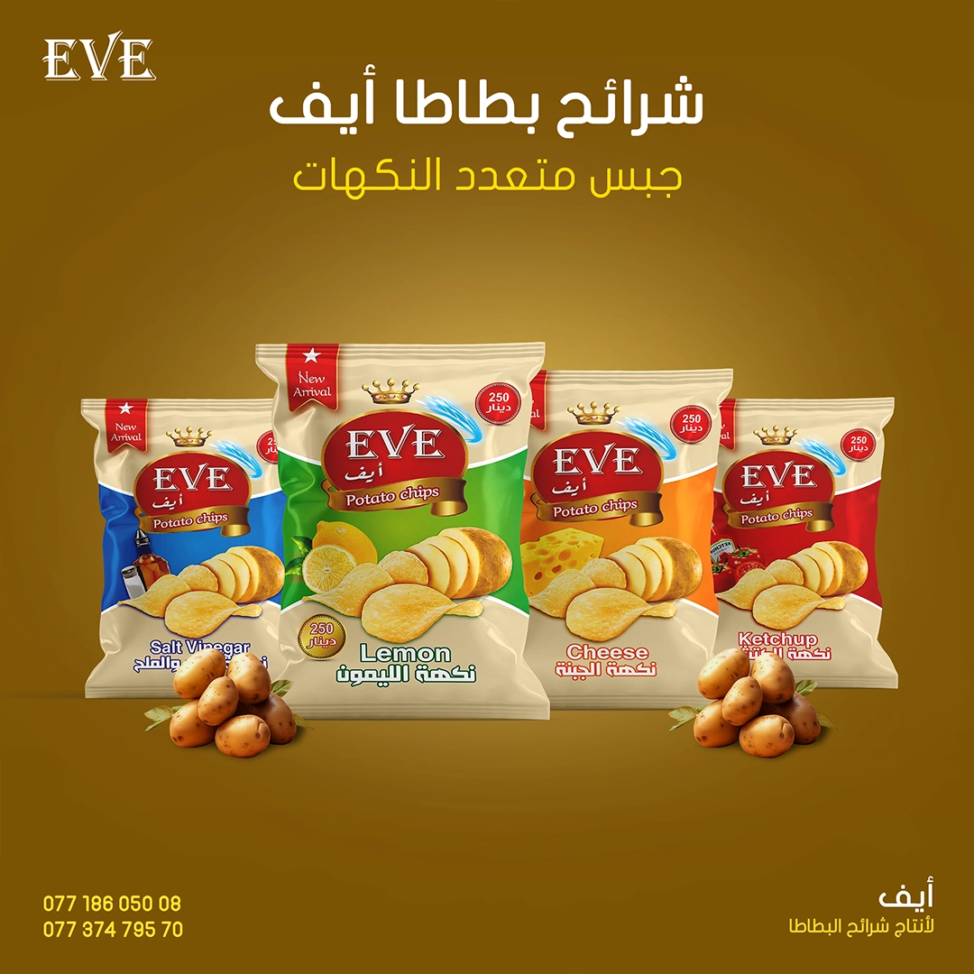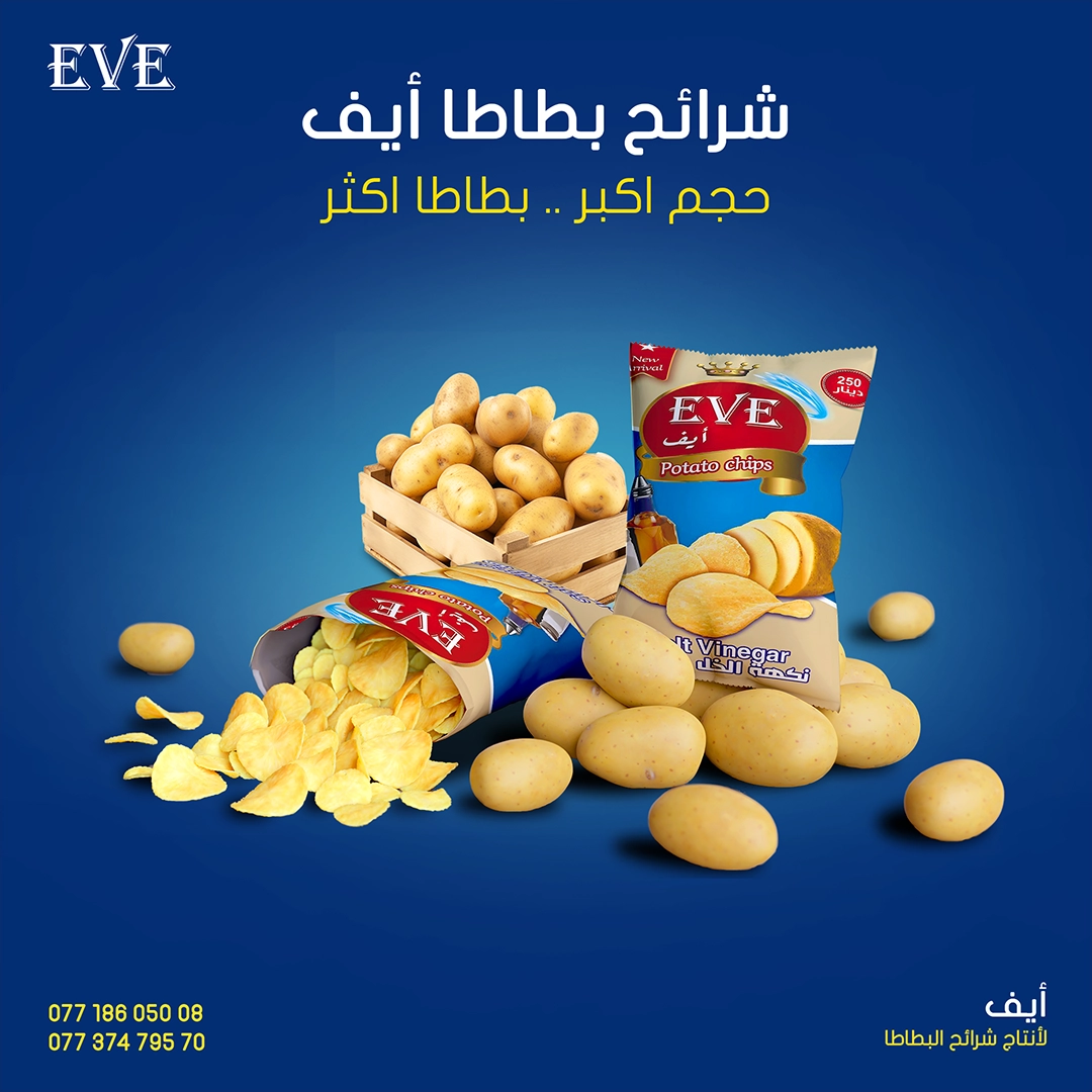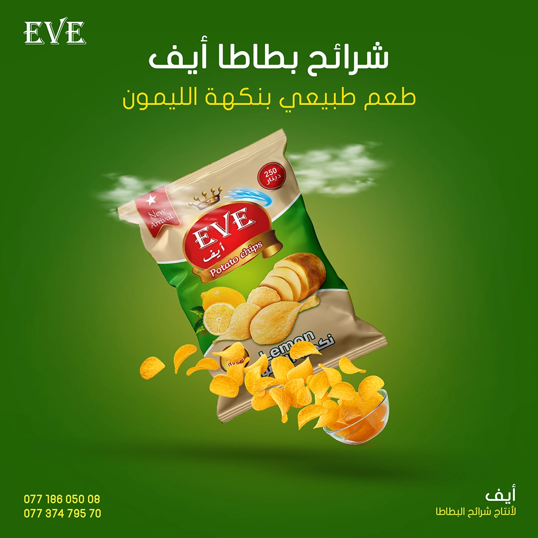 في هذا المشروع قمنا بتصميم باقة من منشورات التواصل الاجتماعي لمنتج شرائح بطاطا EVE، والتي تهدف إلى إبراز الطعم الطبيعي المستخلص من المزارع المحلية، وتسليط الضوء على تنوع النكهات التي تناسب جميع أفراد العائلة.