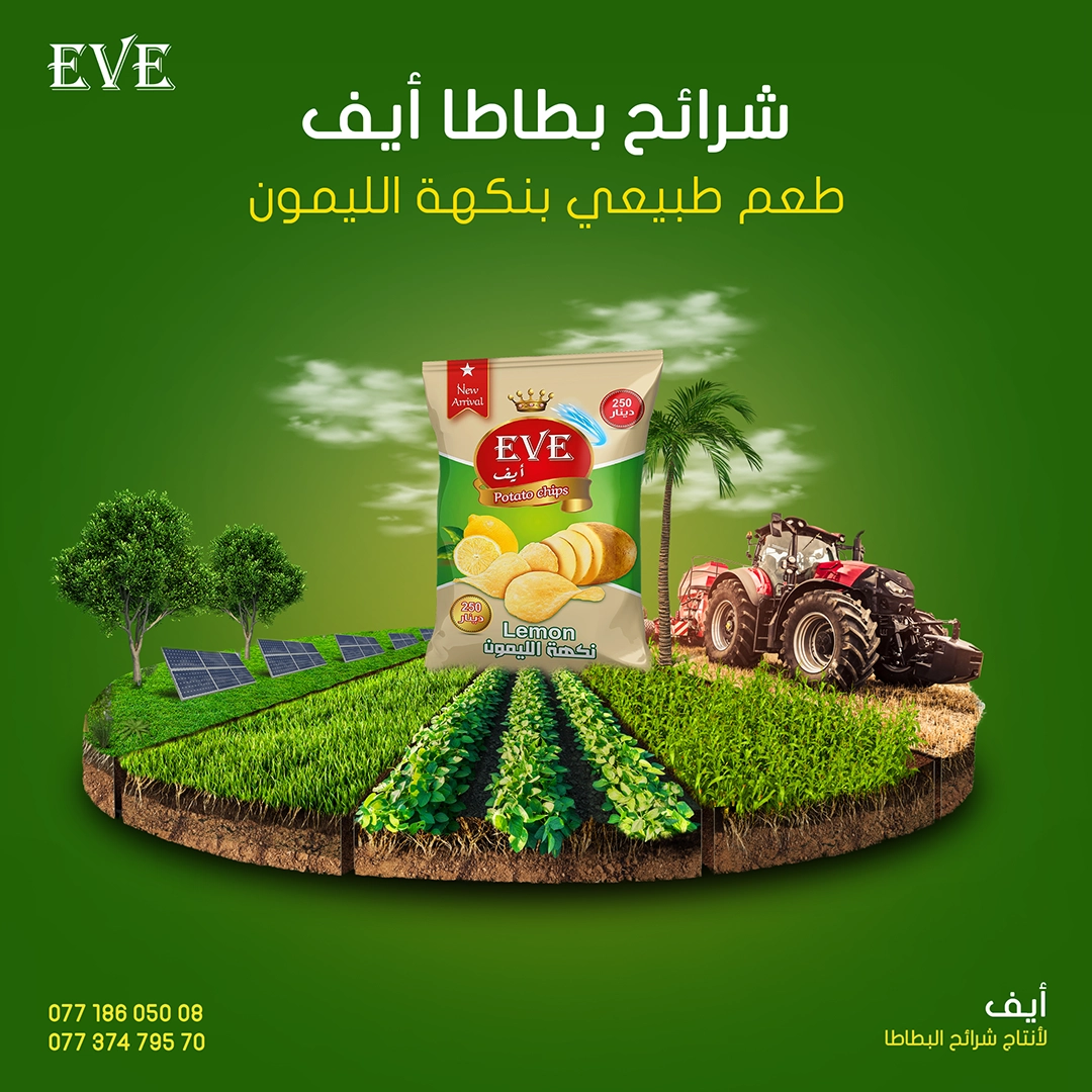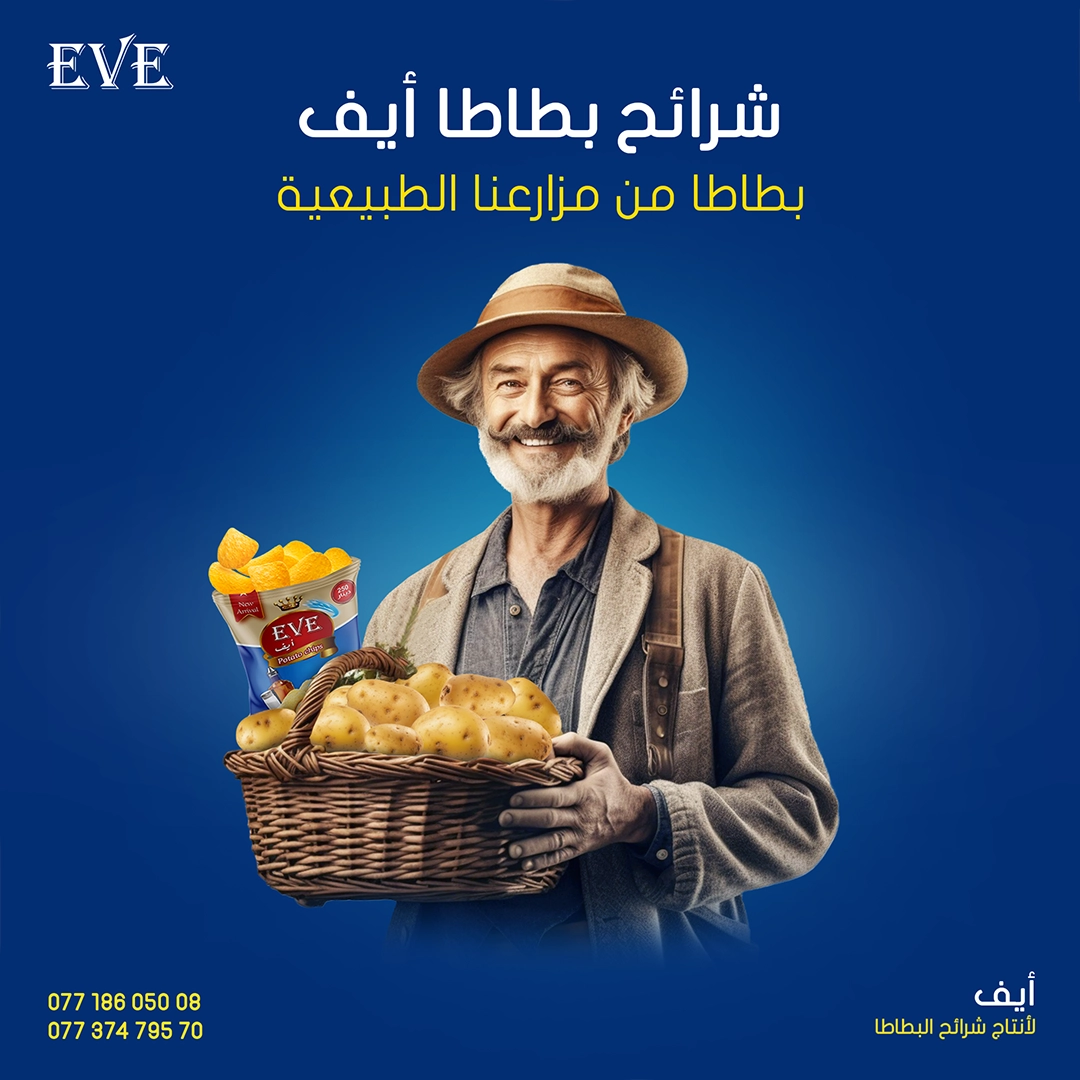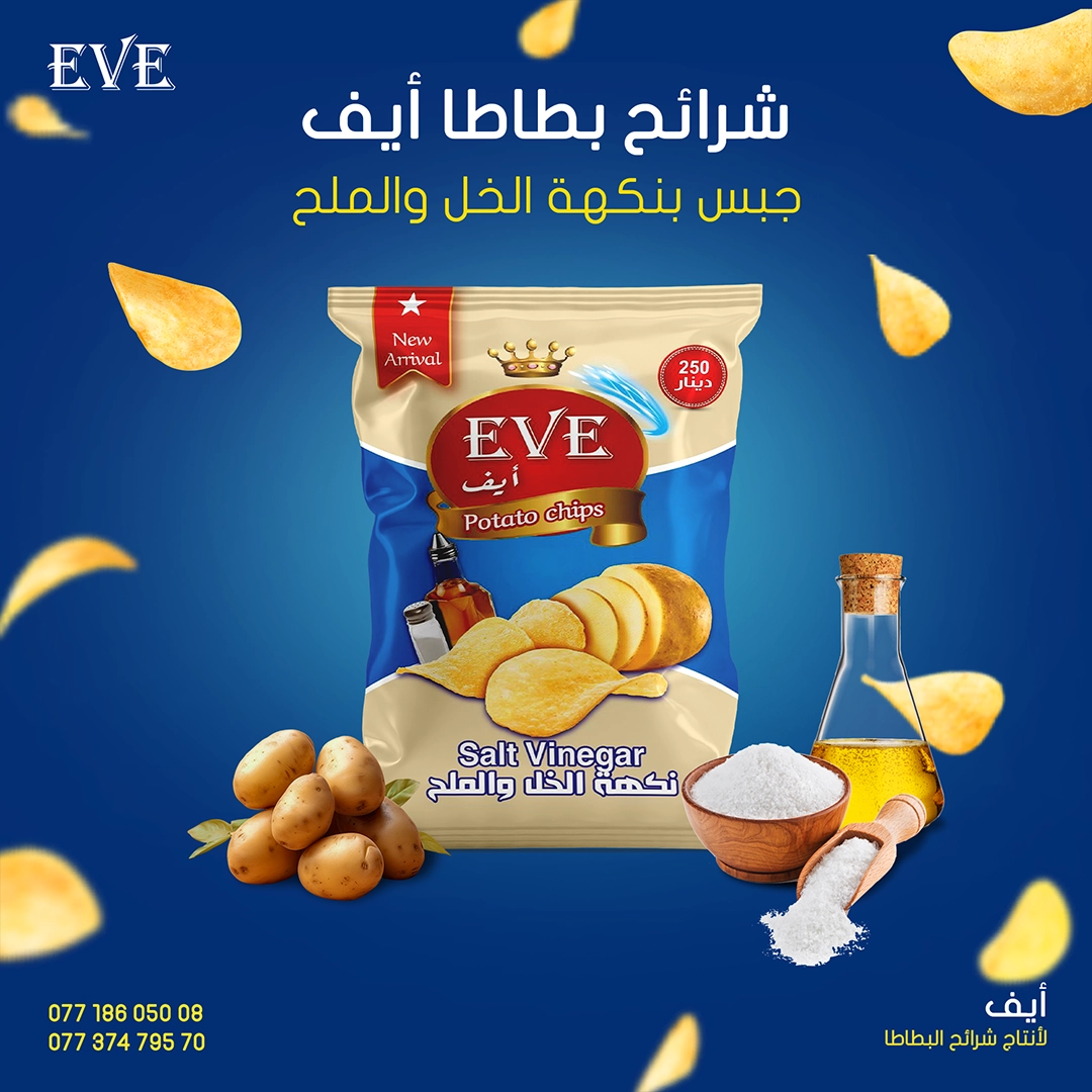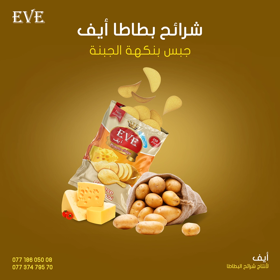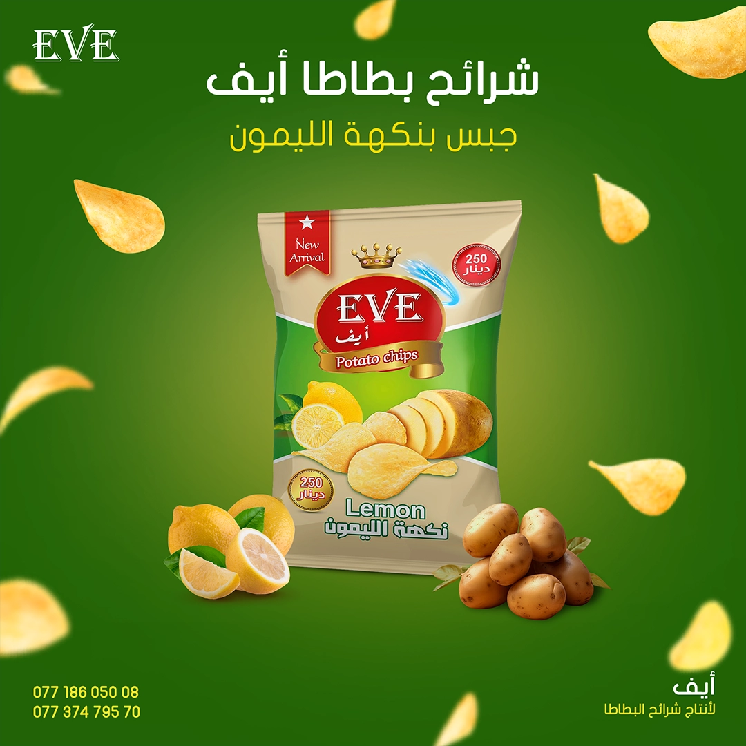 في هذا المشروع قمنا بتصميم باقة من منشورات التواصل الاجتماعي لمنتج شرائح بطاطا EVE، والتي تهدف إلى إبراز الطعم الطبيعي المستخلص من المزارع المحلية، وتسليط الضوء على تنوع النكهات التي تناسب جميع أفراد العائلة.
