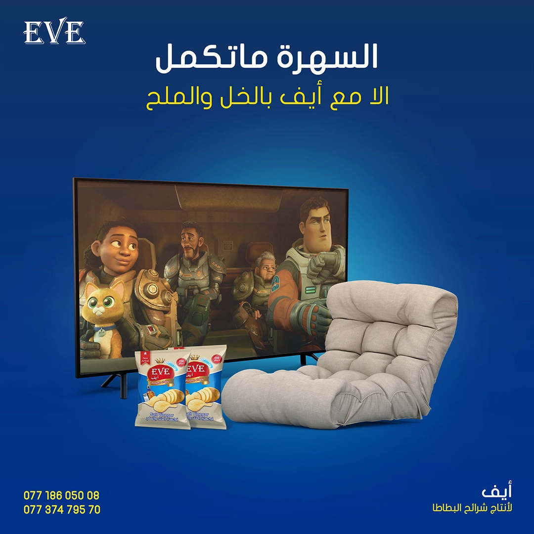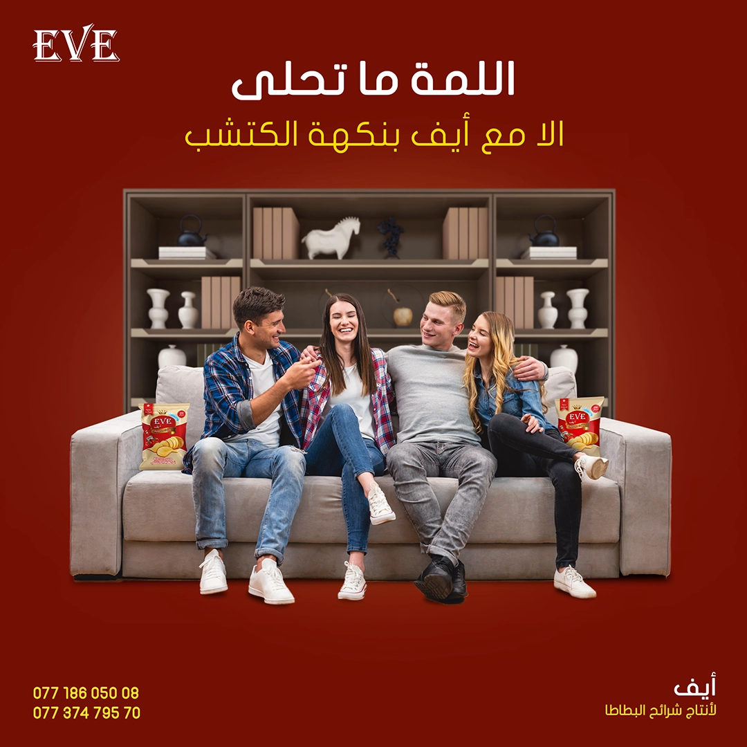 ارتكز أسلوب التصميم على المزج بين الصور الواقعية (العائلة، المزارع، البطاطا الطبيعية) والعناصر الإبداعية (شرائح بطاطا متطايرة، طاولة الطعام، لمّة الأصدقاء)، لإيصال رسالة بسيطة ومباشرة بأن EVE Chips منتج طبيعي يضيف نكهة خاصة لكل لحظة.